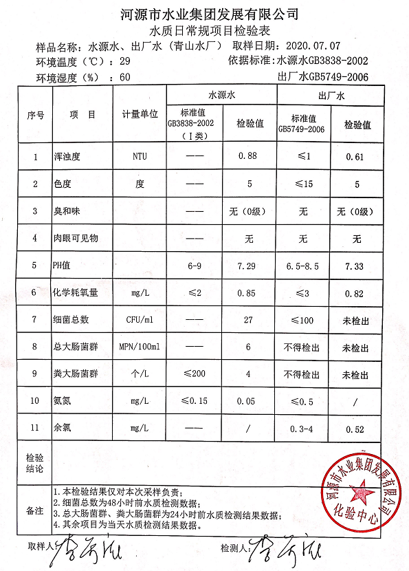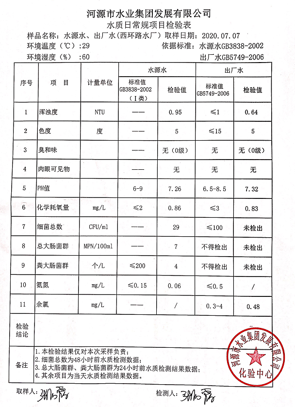 2020年7月7日水質(zhì)檢驗報告