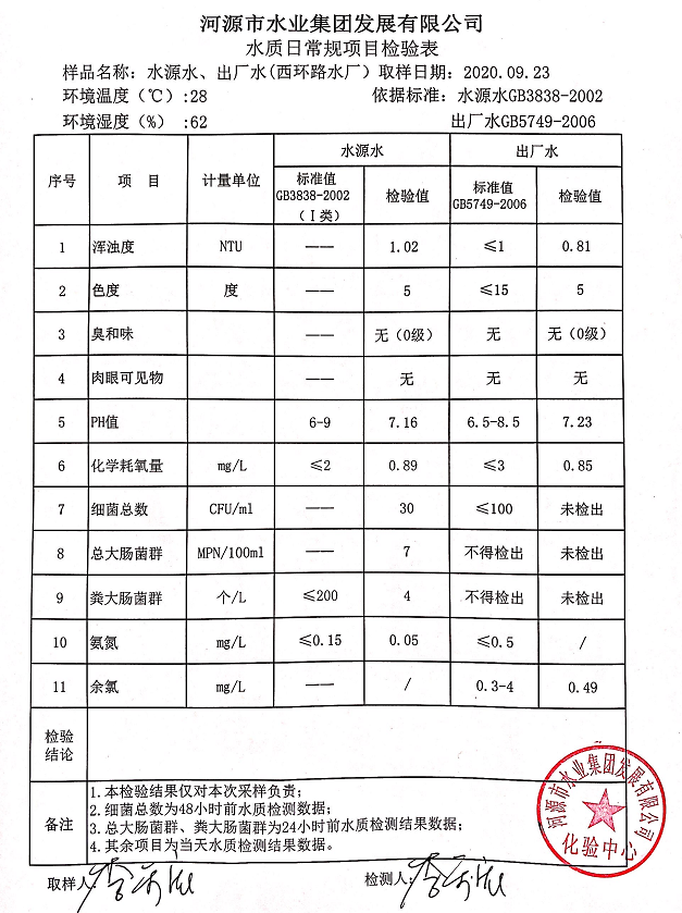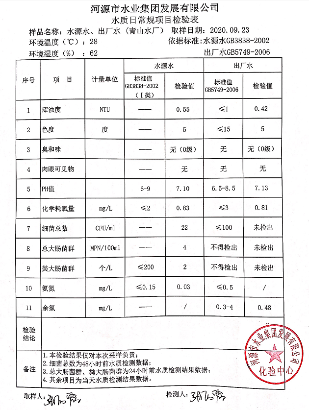 2020年9月23日水質(zhì)檢驗(yàn)報告