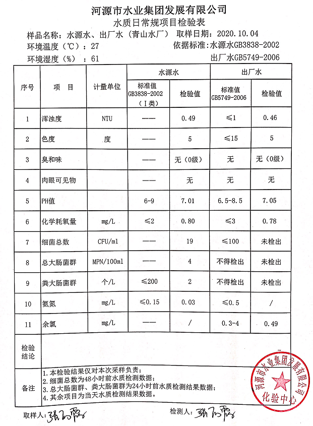 2020年10月4日水質(zhì)檢驗(yàn)報告