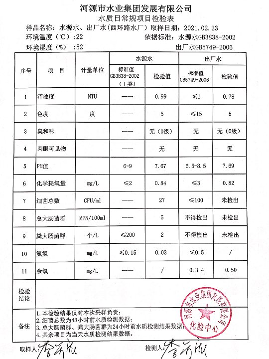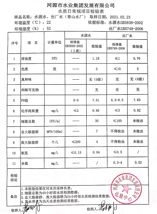 2021年2月23日水質(zhì)檢驗(yàn)報告