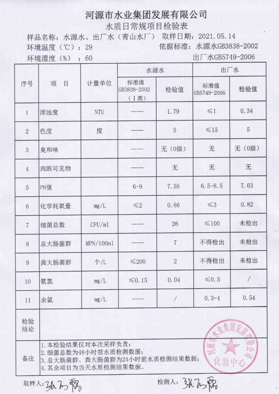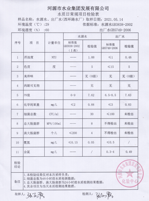 2021年5月14日水質(zhì)檢驗(yàn)報告