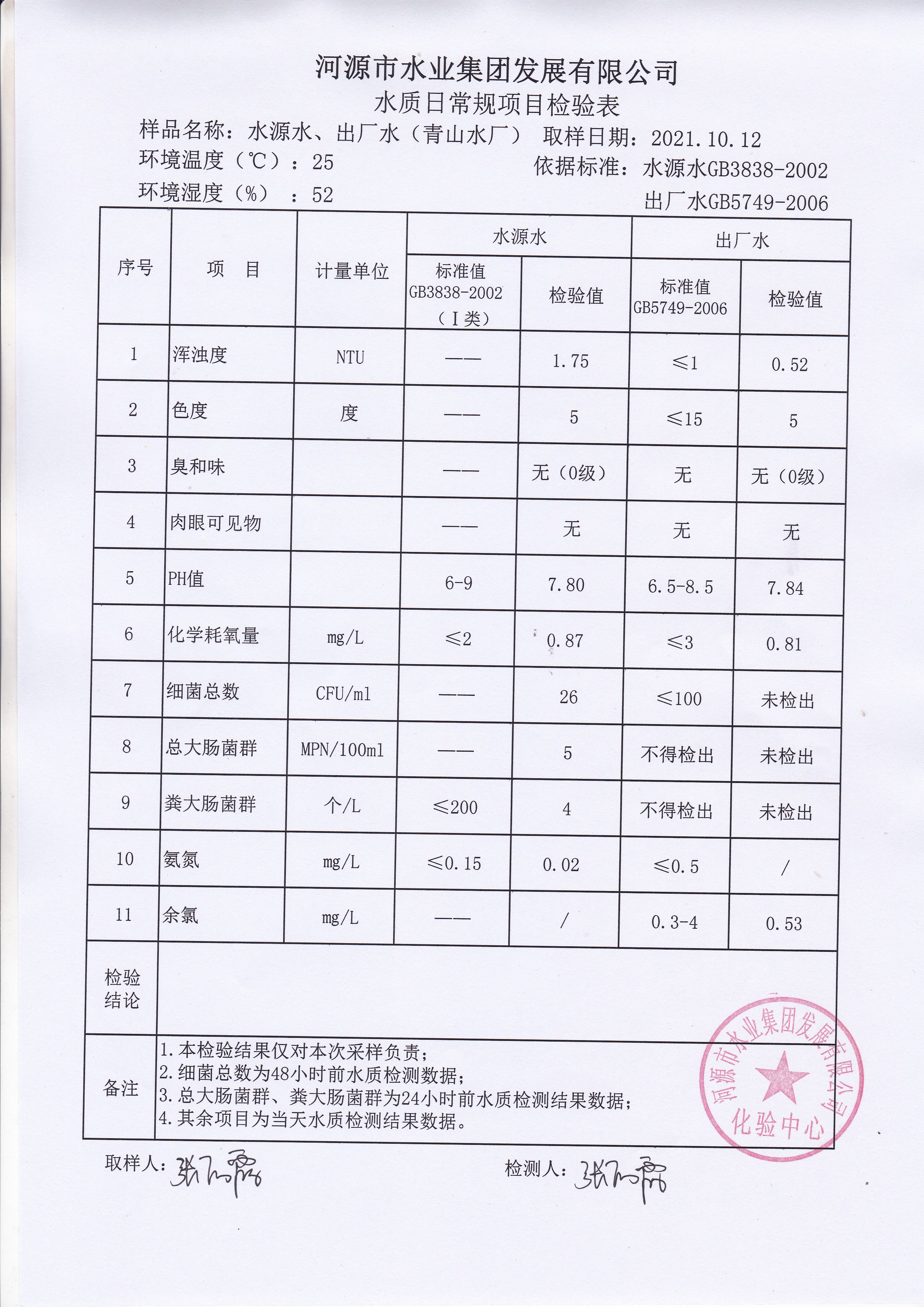 2021年10月12日水質(zhì)檢驗報告