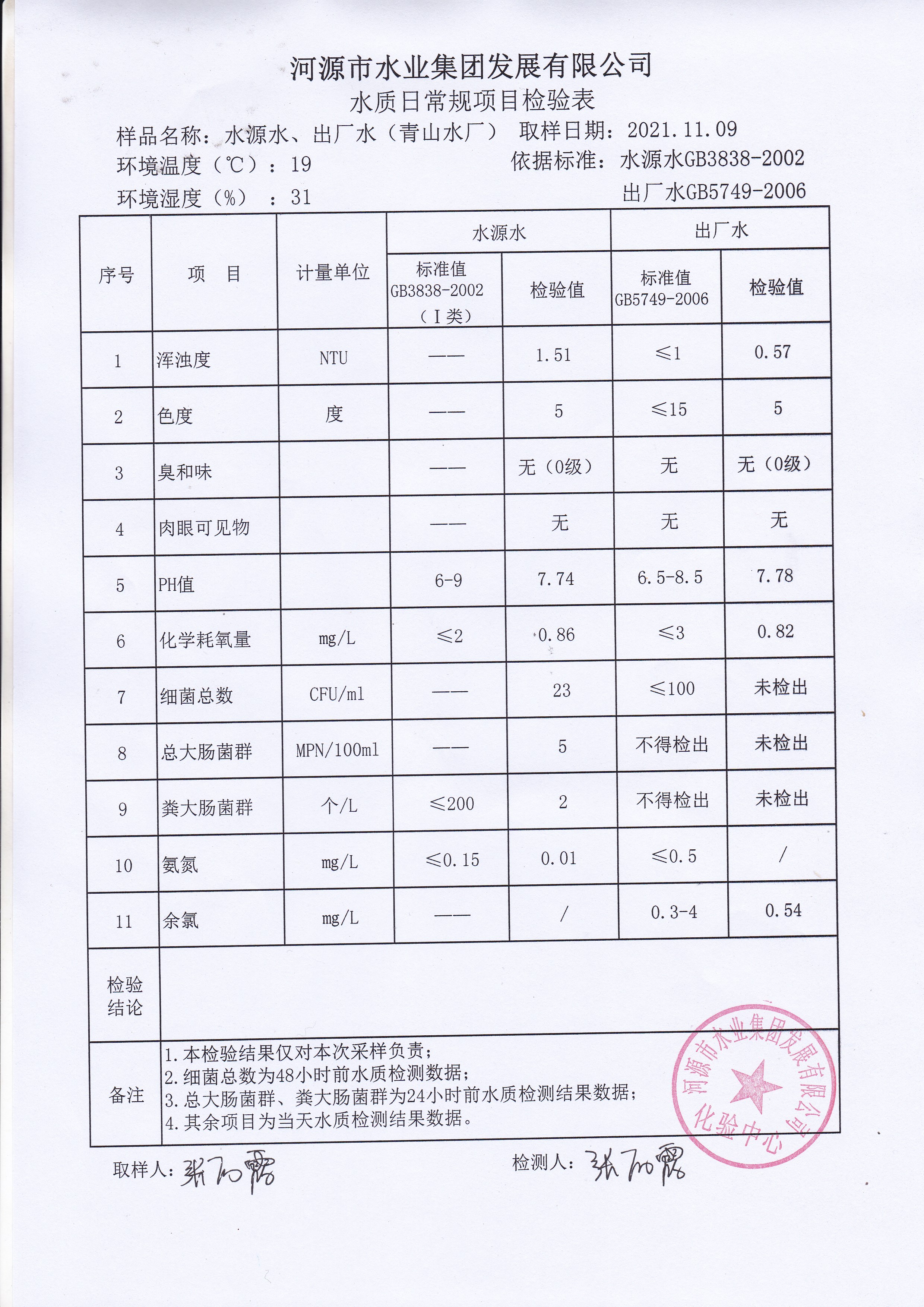 2021年11月9日水質(zhì)檢驗(yàn)報(bào)告