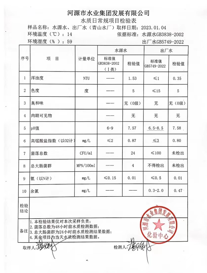 2023年1月4日水質(zhì)檢驗(yàn)報(bào)告