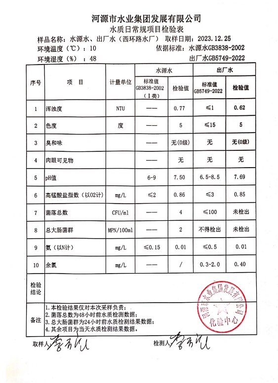 2023年12月25日水質(zhì)檢驗報告