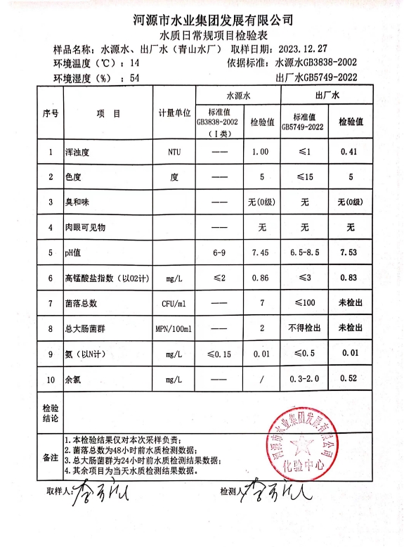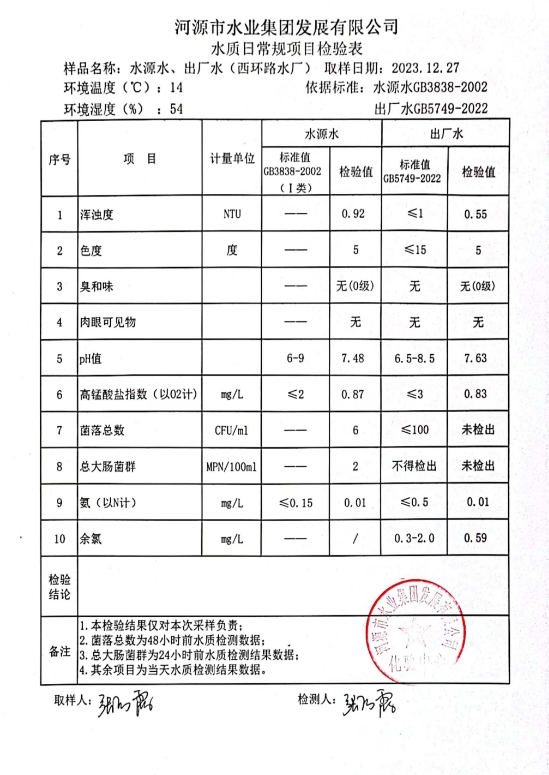 2023年12月27日水質(zhì)檢驗(yàn)報告