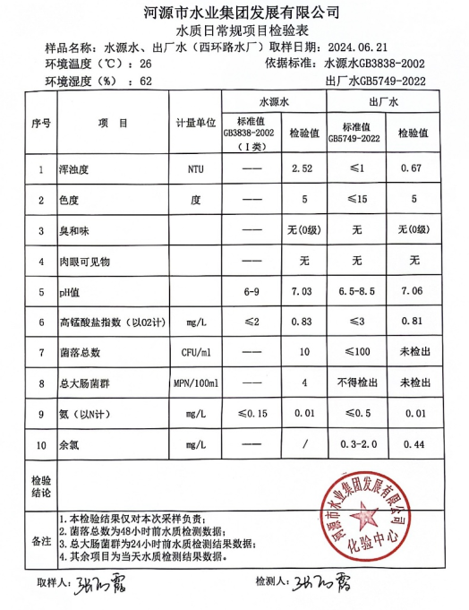 2024年6月21日水質(zhì)檢驗(yàn)報告