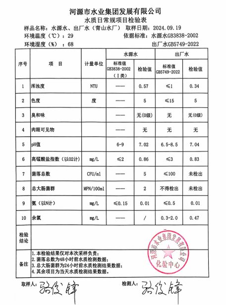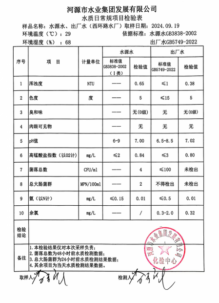 2024年9月19日水質(zhì)檢驗報告