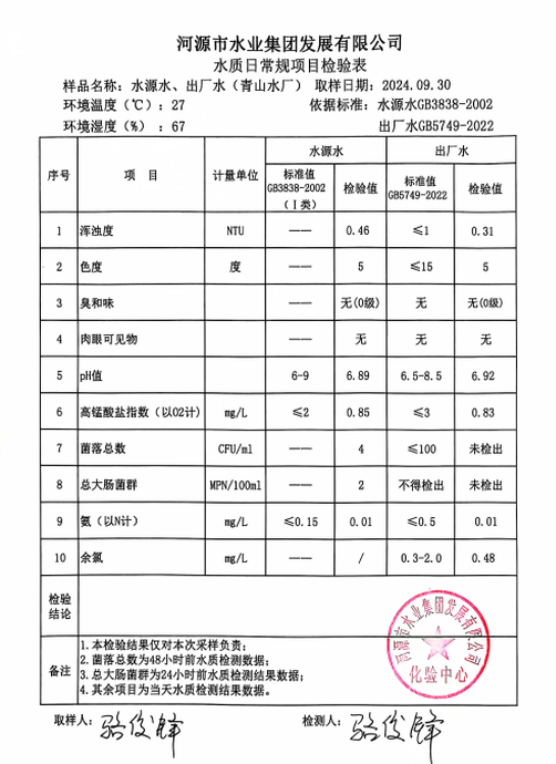 2024年9月30日水質(zhì)檢驗報告