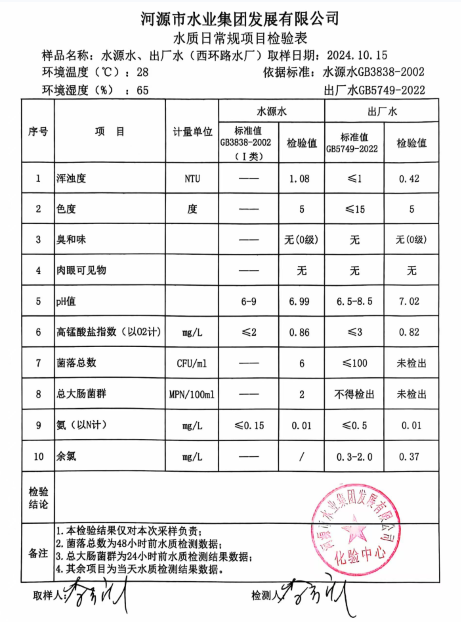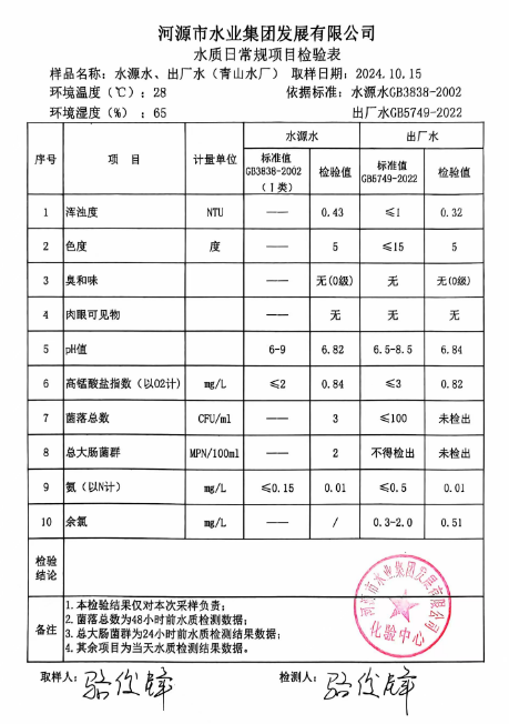 2024年10月15日水質(zhì)檢驗(yàn)報(bào)告